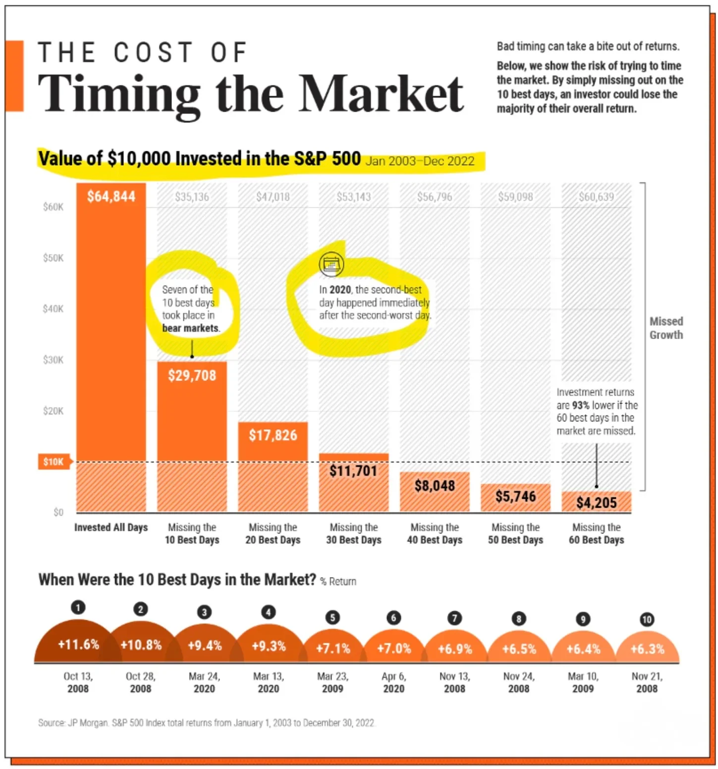 There’s another key principle that separates pros from amateurs: time in the market beats trying to time the market. Study after study confirms that trying to perfectly enter or exit markets causes far more harm than good. Refer to the picture below to see how your portfolio's performance would’ve been drastically affected by missing just the 10 best days in the stock market in a 9 year time span. The data shows that long-term presence in high-potential markets outperforms even the most advanced trading strategies.